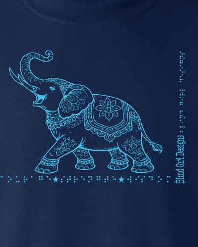 Underneath the elephant are the words “courage*strength*wisdom In grade 1 braille”