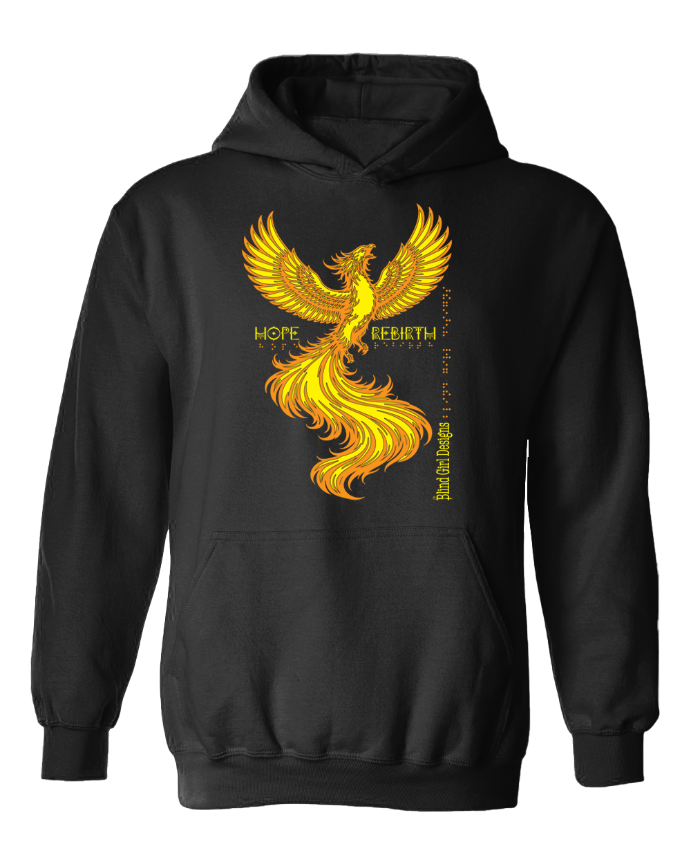 Centered near the wings, the words “HOPE” and “REBIRTH” appear on either side of the phoenix in a clean, modern font, reinforced by grade one braille underneath each word. Along the right side, vertically oriented text reads “Blind Girl Designs,” in both words and tactile Braille, serving as a subtle signature without overpowering the artwork.