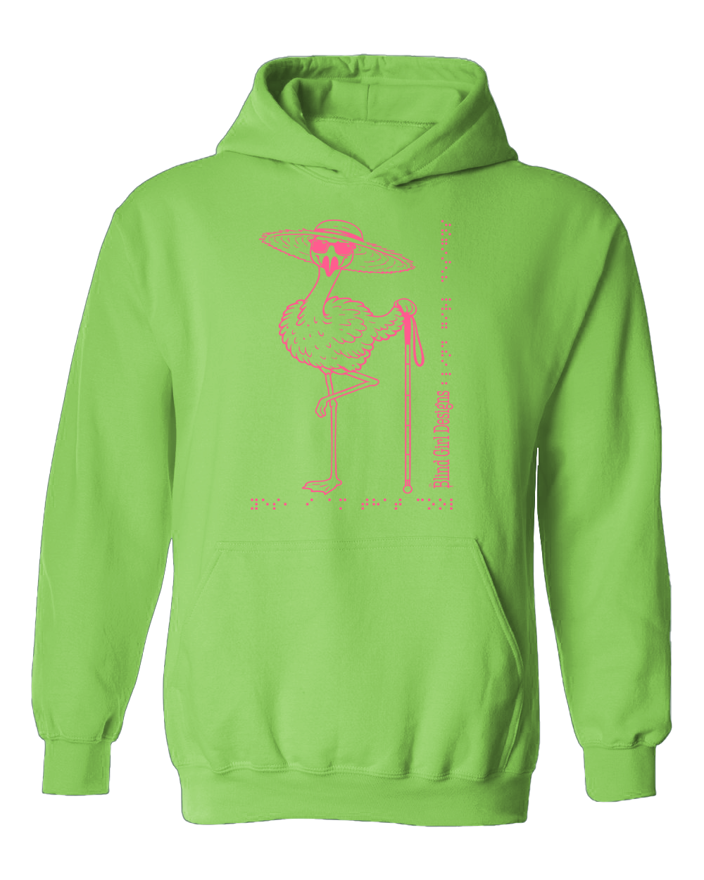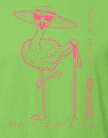 Pink flamingo! we are so happy to say these words! I’ve been working on this for about a year, but not been able to draw a flamingo that I thought was cool enough. We have one in this 3-D tactile, glitter ink  pink flamingo with a big straw hat, Ray-Ban sunglasses, standing on one long skinny flamingo leg-the other leg crossed at an angle, and it’s wing, leaning on a white cane.  The body of the flamingo is wonderful and fluffy, and you can feel the feathers. The flamingo, of course, has a long neck , all the better to hold that big straw hat . All in  pink tactile glitter ink, I mean really- come on ! you’ve got to love this.