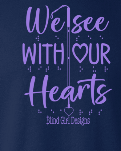 This print says it all! We see with our hearts not with our eyes! In this special edition with purple puff ink and braille, a white cane is proudly displayed down the middle of the words with a little heart where the tip of the white cane should be. The words themselves are in beautiful different fonts, and the O in the word "our" is a heart. The puff ink makes it superbly tactile, and of course, the braille is tactile.