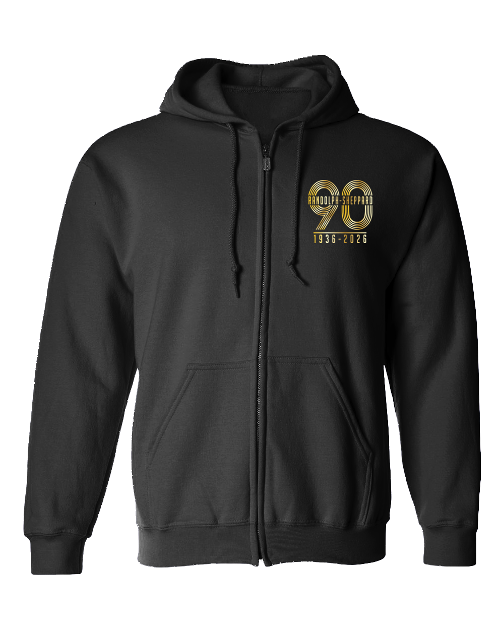 This timeless  black full zip hoodie  features a  classic  design accented by a refined left-chest  embroidered  logo. The gold emblem highlights a  large,  bold  art deco style “90” with elegant line detailing, paired with  “ Randolph-Sheppard”  in the center of the logo,  and the years 1936–2026 at the bottom of this beautiful logo- marking  the significant  90th anniversary with understated sophistication.