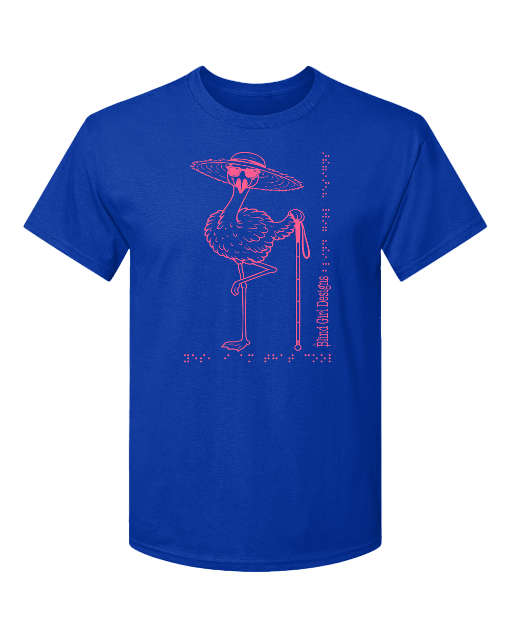 Pink flamingo! we are so happy to say these words! I’ve been working on this for about a year, but not been able to draw a flamingo that I thought was cool enough. We have one in this 3-D tactile, glitter ink  pink flamingo with a big straw hat, Ray-Ban sunglasses, standing on one long skinny flamingo leg-the other leg crossed at an angle, and it’s wing, leaning on a white cane.  The body of the flamingo is wonderful and fluffy, and you can feel the feathers. The flamingo, of course, has a long neck , all the better to hold that big straw hat . All in tactile glitter ink, I mean really- come on ! you’ve got to love this.