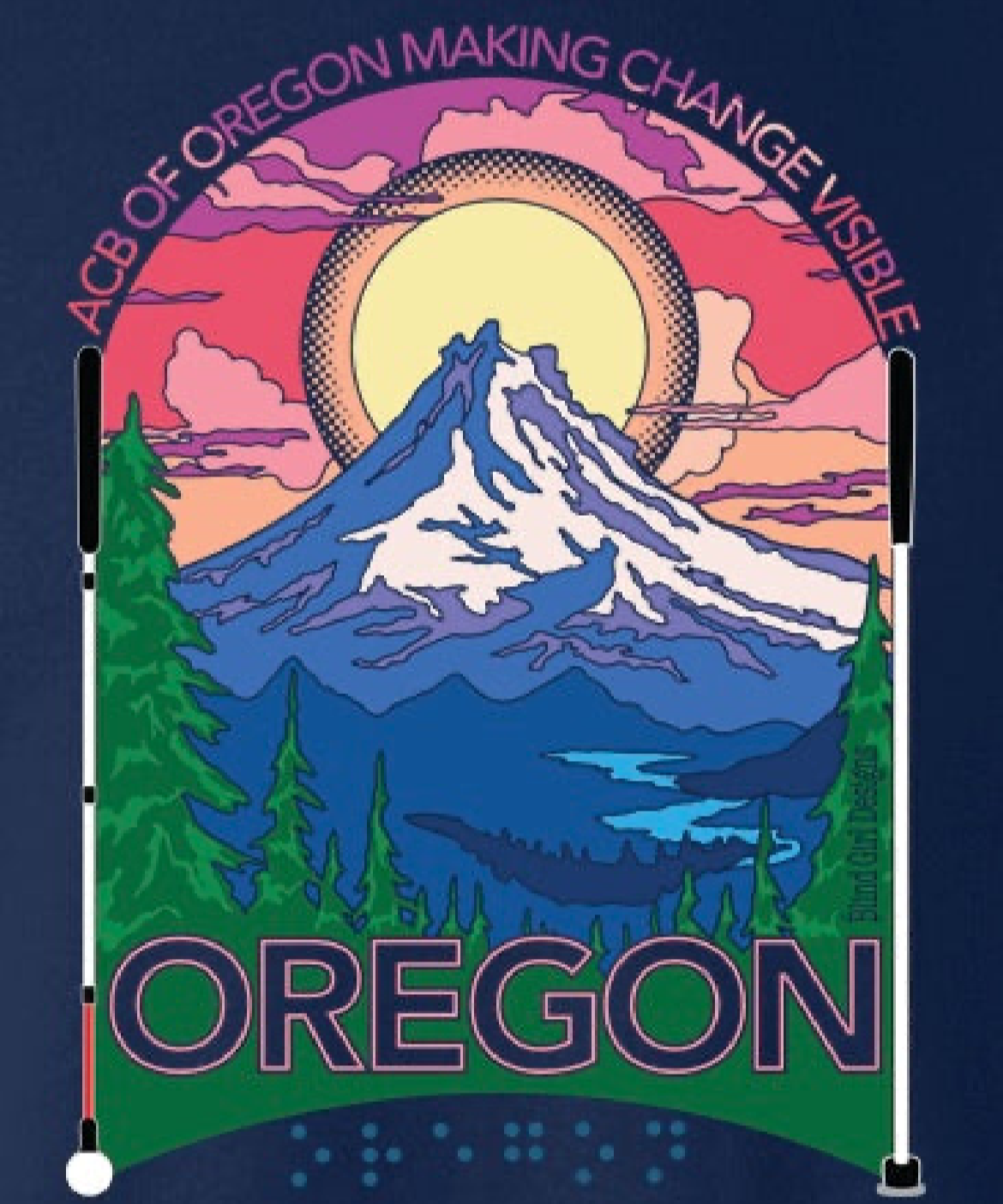 The bottom of the print of each shirt has a very bold Oregon in it outlined in a peach color that matches the sky. You should note that on every color of garment the word Oregon is a different color because we cut the ink out of the inside of the letter to make it more tactile and more beautiful. Underneath the word Oregon is the word Oregon in a smoky blue braille.