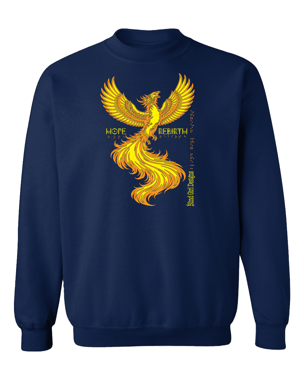 Centered near the wings, the words “HOPE” and “REBIRTH” appear on either side of the phoenix in a clean, modern font, reinforced by grade one braille underneath each word. Along the right side, vertically oriented text reads “Blind Girl Designs,” in both words and tactile Braille, serving as a subtle signature without overpowering the artwork.