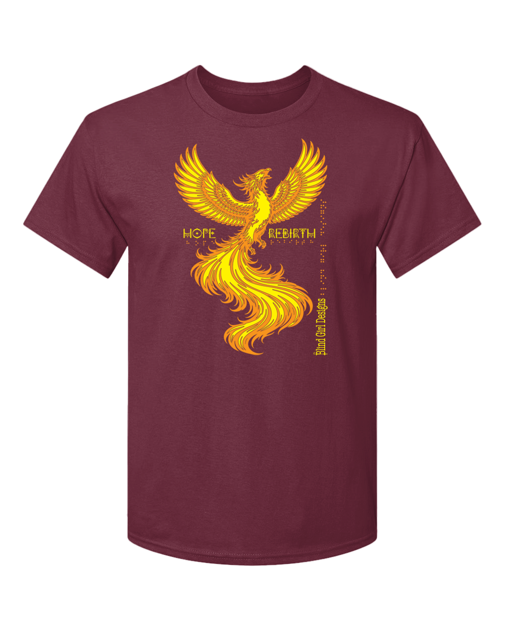 Centered near the wings, the words “HOPE” and “REBIRTH” appear on either side of the phoenix in a clean, modern font, reinforced by grade one braille underneath each word. Along the right side, vertically oriented text reads “Blind Girl Designs,” in both words and tactile Braille, serving as a subtle signature without overpowering the artwork.