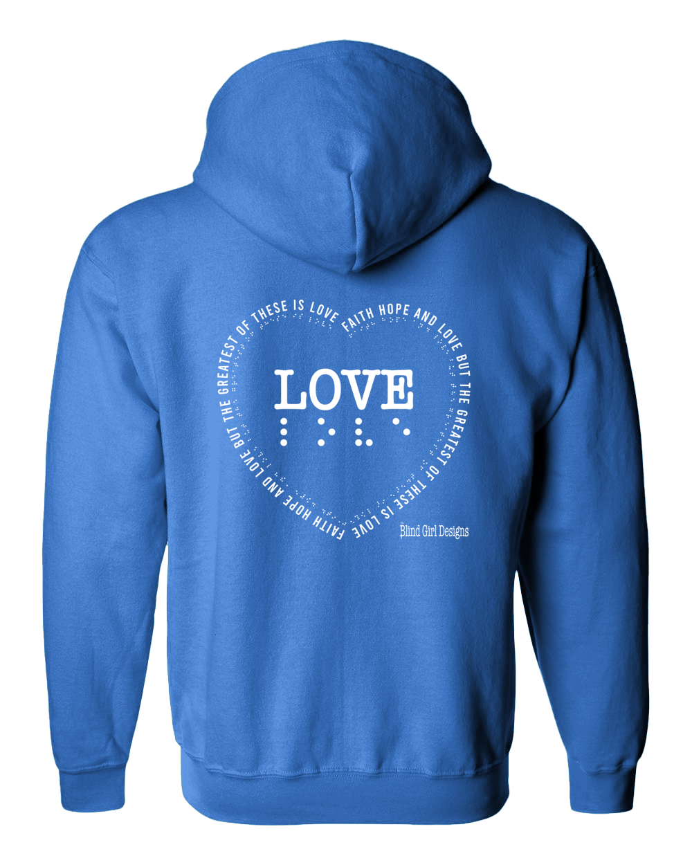 Beneath the letters are the same words in braille. The center of the heart has one word, LOVE. It is large and in a font called American typewriter. Underneath it love is written in tactile braille.